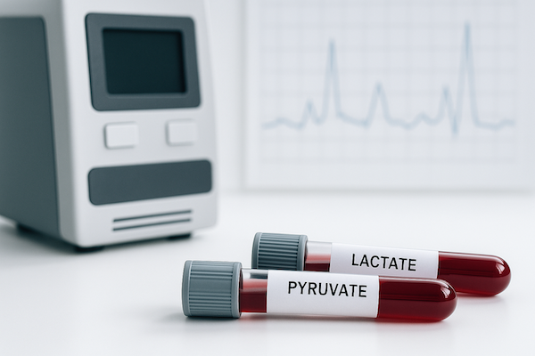 - Піруват — ключовий метаболіт аеробного обміну. Його рівень оцінюють разом із лактатом для розрахунку співвідношення.