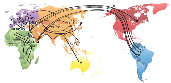 Около 175 000 лет назад зародилось современное человечество где-то в Восточной Африке. Через некоторое время, люди начали мигрировать из Африки и заселять остальной мир, и по мере того, как они поселялись в различных географических районах, их ДНК принимала отличительные маркеры, создавая генетические записи миграций наших предков по древнему миру. Эти маркеры определяют гаплогруппу, к которой вы относитесь, которая связана с местом происхождения, как показано буквами в нижеприведенной карте.