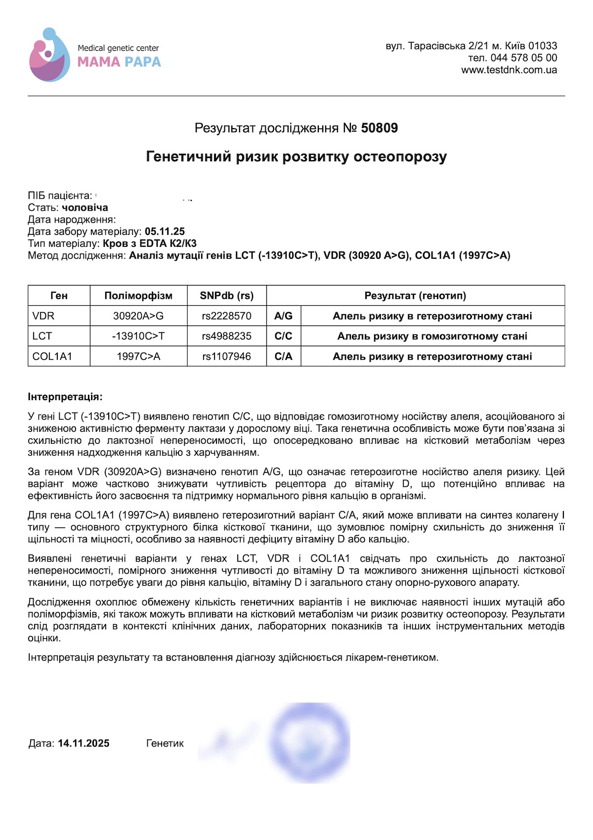 Кодирует лактазу – фермент, осуществляющий гидролиз лактозы в тонком кишечнике. Непереносимость лактозы может нарушать метаболизм кальция, снижая его концентрацию в крови, что приводит к уменьшению костной массы и увеличению риска переломов.
